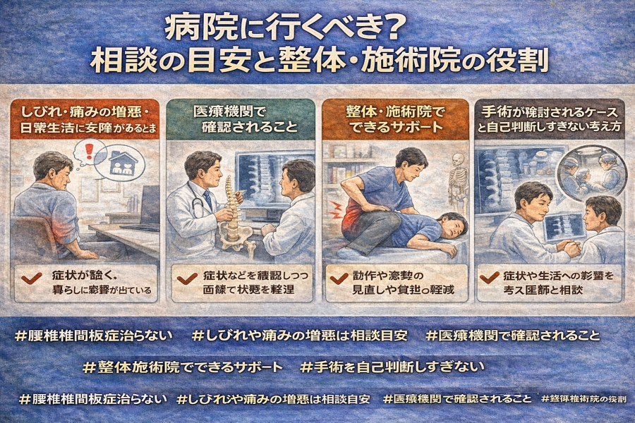 一方で、腰椎椎間板症が長引く背景には、長時間座ること、前かがみ姿勢、体の使い方のクセ、腰まわりの筋力や柔軟性の低下などが重なっている場合もあると言われています。そうしたとき、整体・施術院では、腰だけでなく骨盤や股関節、座り方、立ち方、日常の負担のかかり方を整理し、動き方を見直すサポートが考えられるようです。病気そのものを確定する役割というより、負担を減らすための体の使い方や生活動作を整える入口として捉えるとわかりやすいでしょう。