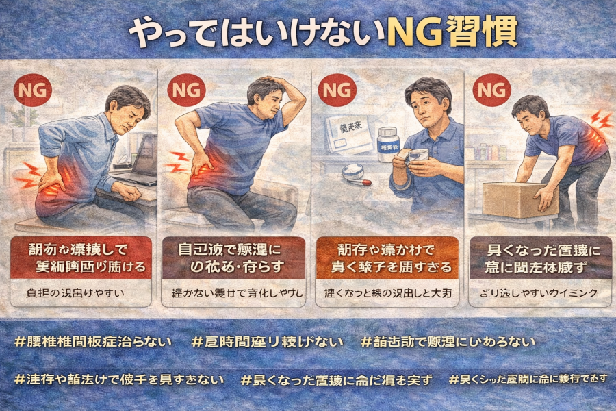 品川志匠会系の記事でも、原因として長時間座ること、前かがみ作業、姿勢の悪さが挙げられています。座っている時間が長いと腰まわりに負担が集中しやすく、さらに前かがみが続くと椎間板へストレスがかかりやすいようです。つまり、「特別なことはしていないのに改善しない」と感じる背景に、毎日の座り方や作業姿勢が関係している場合もあると言われています。