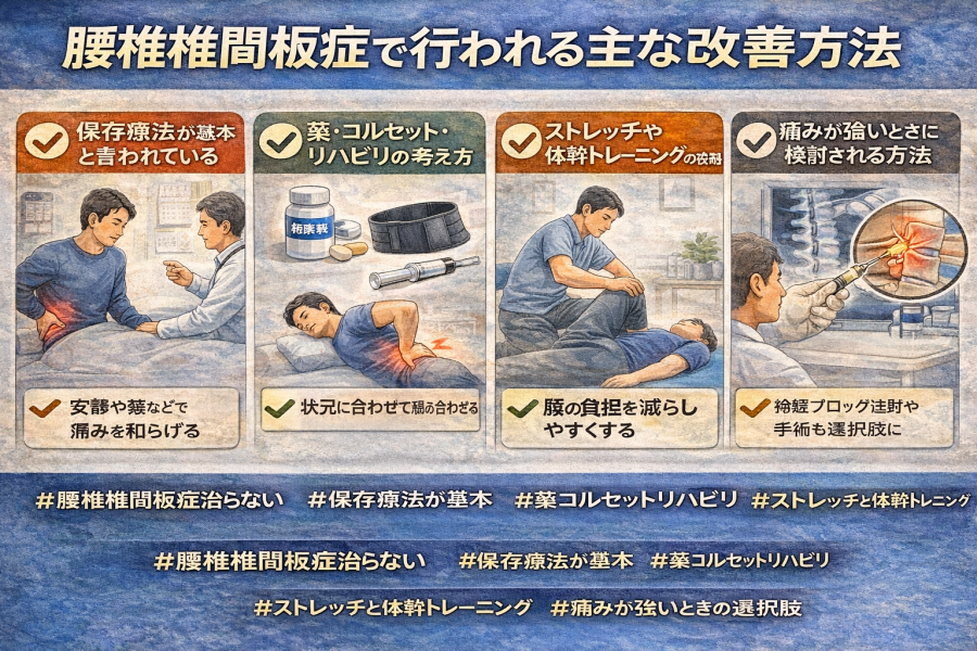 品川志匠会系の解説では、腰椎椎間板症の改善方法として、まず保存療法が基本で、症状に応じて進めていくと説明されています。TENTIAL の記事でも、一般的な対応として安静、内服薬、コルセット、神経ブロック注射などが挙げられています。つまり、腰椎椎間板症は“すぐに大きな処置をする病気”というより、まずは痛みを落ち着かせながら、負担を減らして経過を見る考え方が中心と言われています。