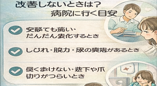 手足ではなくても、脚のしびれ、力の入りにくさ、尿や便の異常がある場合は注意が必要です。腰由来の神経症状が関係していることもあり、自己判断で様子見を続けないほうが安心です。こうした症状は、整形外科で早めに相談したいサインと考えられています。