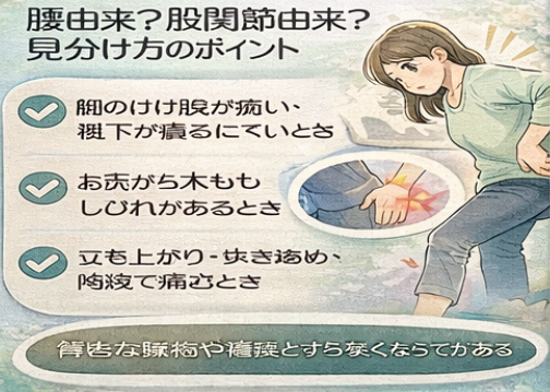 反対に、お尻から太ももの外側や後ろ、ふくらはぎまで痛みやしびれが広がる場合は、腰由来の神経の影響を考えやすくなります。もちろん股関節の不調でもお尻周辺がつらいことはありますが、しびれや脱力がはっきりあるなら、腰から来ている可能性も高くなります。腰痛から股関節痛に見えても、実は神経の通り道に沿った痛みということもあるんです。