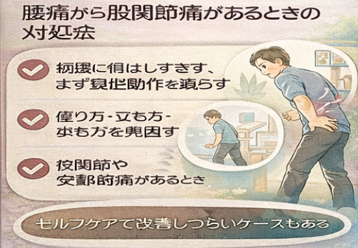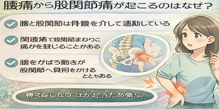 反対に、腰をかばう動きそのものが股関節に負担をかけることもあります。腰がつらいと、無意識に前かがみを避けたり、片脚に体重を寄せたり、骨盤の動きを小さくしたりしやすいです。すると、本来なら腰と一緒に働くはずの股関節が頑張りすぎて、脚の付け根やお尻まわりがつらくなることがあります。腰痛から股関節痛が広がるケースでは、この「かばう動き」がヒントになることも多いです。