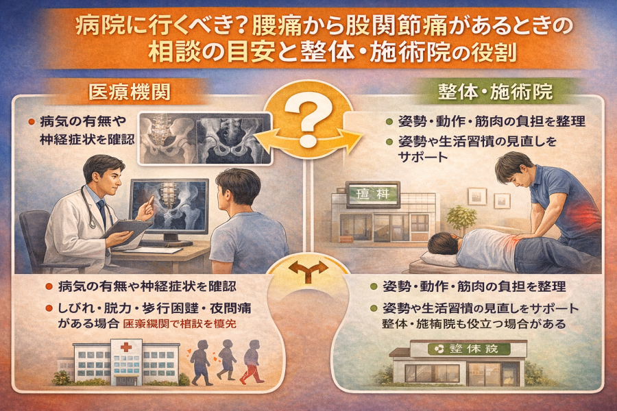 病院に行くべき?腰痛から股関節痛があるときの相談の目安と整体・施術院の役割