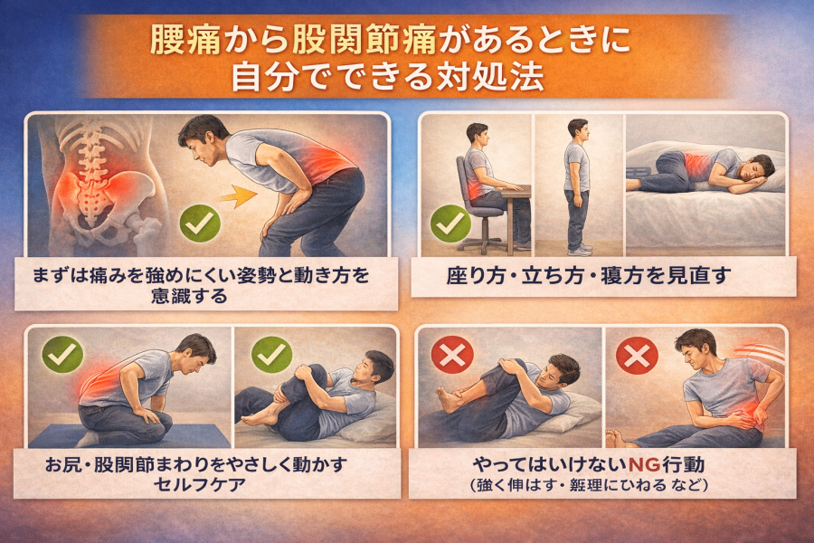 腰痛から股関節痛があるときに自分でできる対処法