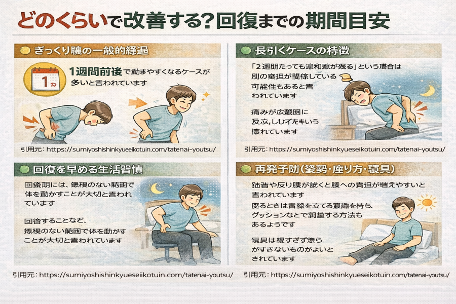 ぎっくり腰の場合、強い痛みは数日で落ち着き、1週間前後で動きやすくなるケースが多いと言われています。急性期を過ぎると、少しずつ体を伸ばせるようになることが多いとされています。