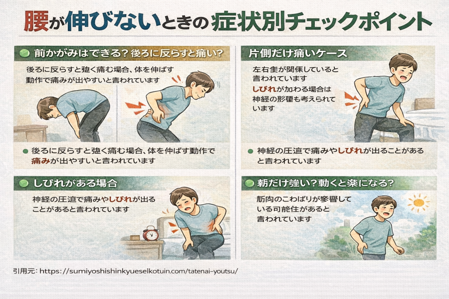 急に腰へ強い負担がかかると、筋肉や関節まわりに炎症が起き、体を伸ばそうとすると痛みが走ることがあると言われています。とくに動き始めや姿勢を変える瞬間に強く出るのが特徴とされています。