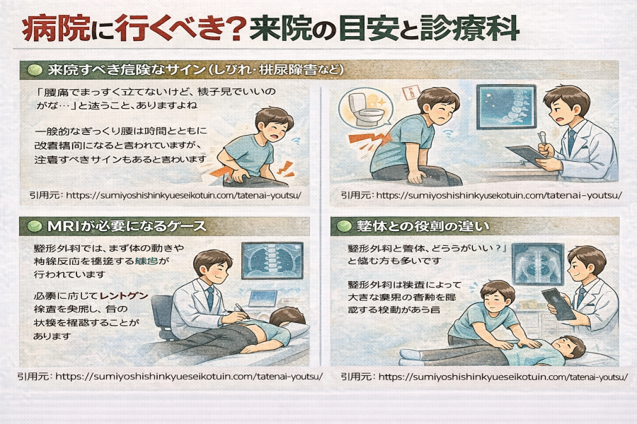 一方で、歩くと悪化する場合は別の要因も考えられるとされています。腰痛でまっすぐ立てないときは、痛みの出方や時間帯を観察することが判断材料になるようです。