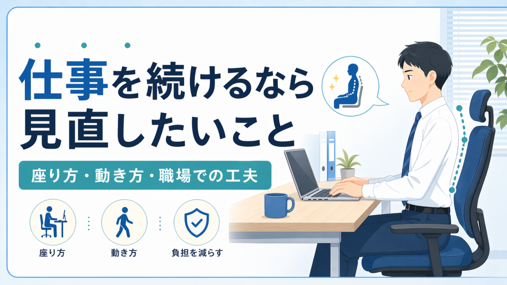 再発予防のためには、席の環境、休憩の取り方、重い物を扱う頻度、立ちっぱなし時間など、職場で相談できることがないか見直したいです。厚労省の腰痛予防対策でも、作業管理や職場の支援は重要とされています。仕事復帰の後こそ、再発しにくい環境づくりが大切です。