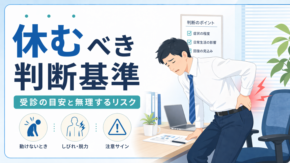 発熱、強いだるさ、体調不良を伴う腰痛も、自己判断しすぎないことが大切です。腰そのものの負担だけでなく、ほかの原因が関係していることもあるためです。腰痛 仕事できないだけでなく、全身状態も悪いときは、無理に出勤しないほうがよいでしょう。