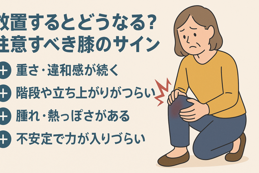 上位サイトでは、膝周囲の筋力低下や関節の安定性の低下などが背景にある可能性が説明されており、生活動作に制限が出てくる時期は相談を検討しやすいタイミングと言われています。