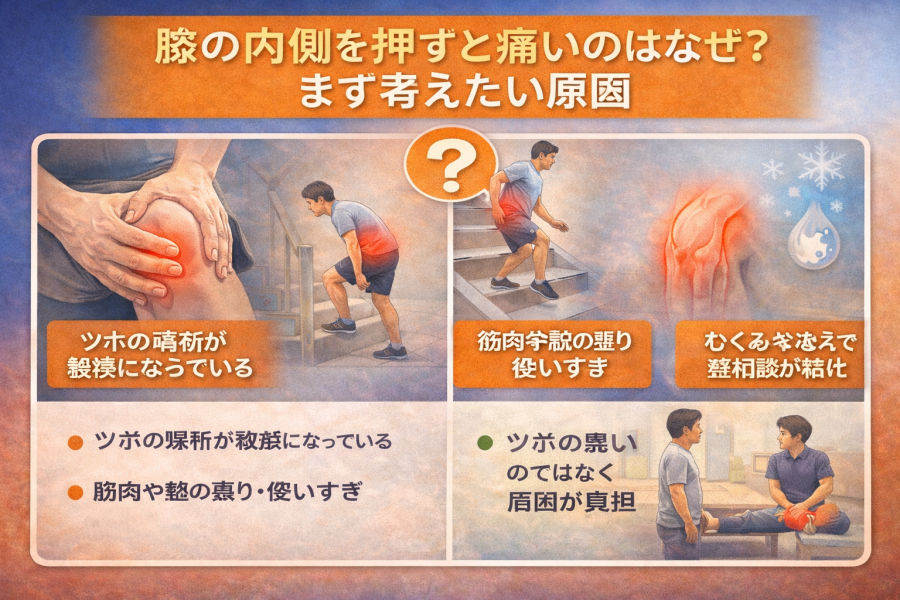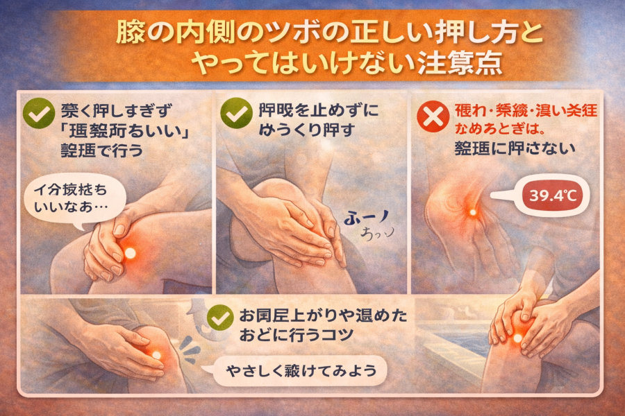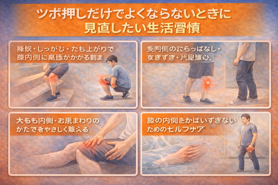 ここで大事なのは、膝の内側を押すと痛いツボがあったとしても、それだけで原因を一つに絞らないことです。最近の整骨院系解説でも、「ツボが悪い」というより、周囲の筋肉・腱・関節への負担が結果としてその場所に出ていることがあると説明されています。つまり、ツボは痛みの出発点というより、体の使い方の偏りや膝まわりの疲労が表に出ているサインとして触れられることがある、ということです。膝の内側を押すと痛いツボが気になるときは、ツボだけを強く押し続けるのではなく、歩き方、立ち方、膝の使いすぎがなかったかまで一緒に振り返ることが大切だと言われています。