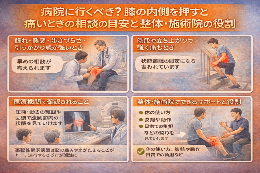 整体・施術院でできることは、医療機関のように画像で病気の有無を確認することではなく、立ち方や歩き方、膝の使い方、太ももやお尻まわりのかたさ、日常での負担のかかり方を整理しながらサポートすることだと言われています。たとえば、片足重心が続いていないか、階段の使い方に偏りがないか、膝内側へ負担が集まりやすい動きになっていないかを見る流れです。一方で、参考記事でも歩けないほどの強い痛みがあるときは専門施設への相談がすすめられており、腫れ・熱感・強い歩行困難がある場合は、まず医療機関を優先する考え方が自然だと言えそうです。病院か整体かで迷ったときは、役割の違いを分けて考えることが大切だと言われています。