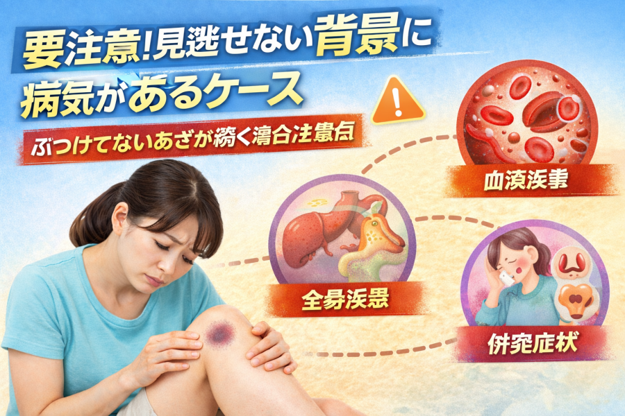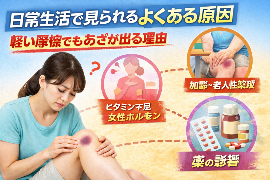 こんな会話が続くと、誰でも少し気になりますよね。もちろん、日常の摩擦や年齢による変化であざが現れることも多いのですが、あざが何度も繰り返す場合や広がるように増える場合は、他の背景が関係していると言われています。