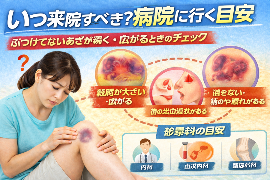 こうした相談はよくあります。ただ、“ぶつけてないのにできたあざ” が続く場合や、広がる感じがするときには、少し慎重に見たいと言われています。