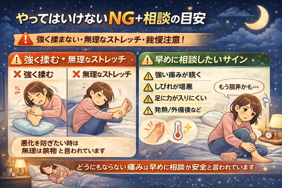 まず、強いしびれや力が入りにくい感覚、急な腫れや熱っぽさなどがある場合は、自己判断で粘りすぎない考え方が大切です。次に、寝姿勢を工夫したり、足元の冷え対策をして“眠れる形”を作ります。最後に、「ピリピリ?」「ズキズキ?」「つる?」など痛みのタイプをざっくり整理すると、温める/冷やす、軽く動かすなどの選び方がしやすくなると言われています。