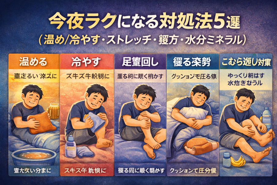 今夜ラクになる対処法5選(温め/冷やす・ストレッチ・寝方・水分ミネラル)