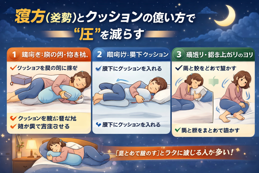 寝方(姿勢)とクッションの使い方で“圧”を減らす