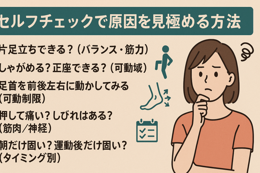 「足首が固いけど、何が原因かよくわからない…」という人は多いです。実は、少し動かしてみたり姿勢を確認したりするだけで、ある程度“原因の目安”を自分で判断できると言われています。ここでは、自宅で簡単にできるセルフチェック方法をご紹介します。