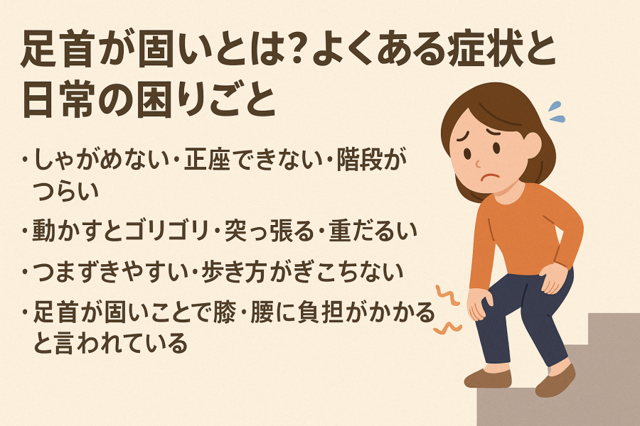 「足首が固い」と感じる人は意外と多く、日常生活の中で“なんとなく動かしにくい”“しゃがむのがつらい”と悩んでいるケースがよくあります。特に、しゃがめない・正座できない・階段の上り下りがきついといった動作の制限は、足首の可動域が狭くなっているサインと言われています。