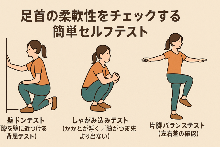 足首の柔軟性は、歩き方や姿勢のクセだけでなく、転倒リスクやふくらはぎの張りとも関係すると言われています。ここでは、自宅で30秒ほどあれば確認できる代表的なテストを紹介しつつ、「どこで引っかかるか」で背景を読み取るヒントも会話形式でまとめました。