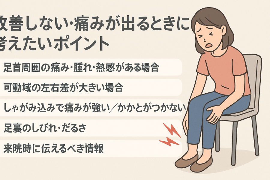 足首の柔軟性を高めるストレッチを続けているのに「なんだか変わらない…」と感じる方や、逆に「痛みが強くなってきた気がする」という相談もあります。ここでは、改善しづらい場合に見直したいポイントを、会話形式でわかりやすくまとめていきます。