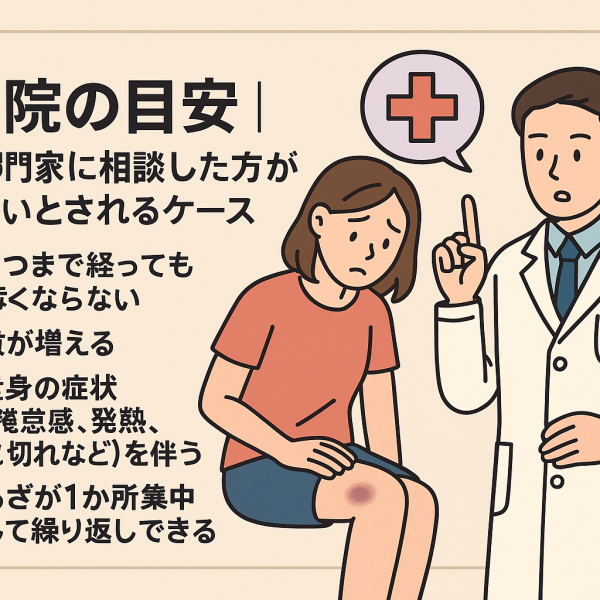 Ubie の症状解説でも、あざの治りの遅さがヒントになるケースがあると紹介されていて、経過を見ることの大切さが強調されています(引用元:Ubie https://ubie.app/)。