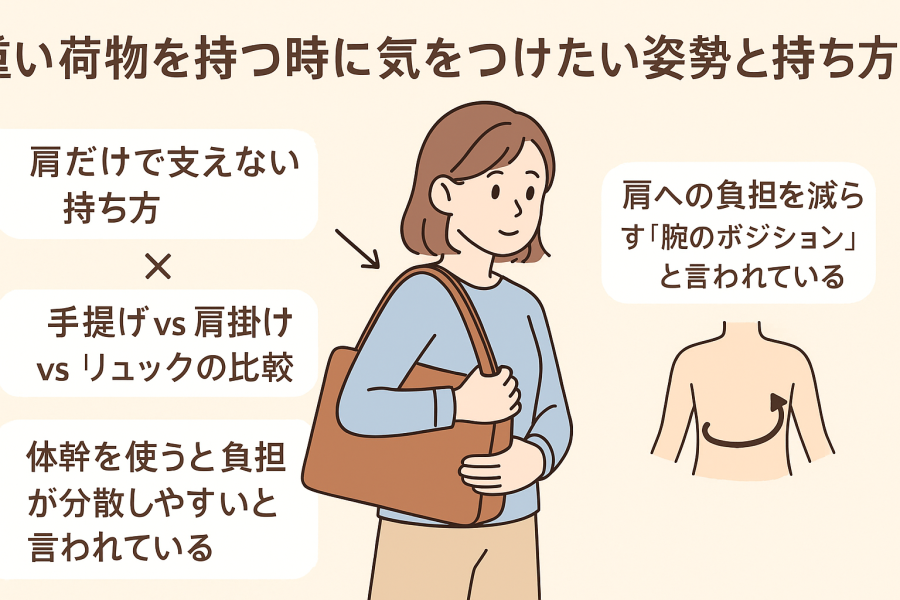そのため、持つ位置はできるだけ体幹(お腹まわり)に近づけることが大切だとされています。肩から遠い位置で荷物を持つほど“てこの原理”のように負担が増えやすいため、腕だけで頑張らず、体全体で支えるイメージが役立つこともあります。