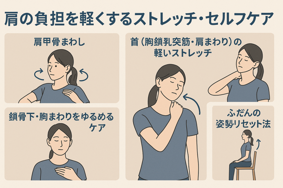 胸を軽く開くストレッチや、鎖骨の下を指でやさしくほぐすケアは、肩の可動域が広がりやすいと言われています。