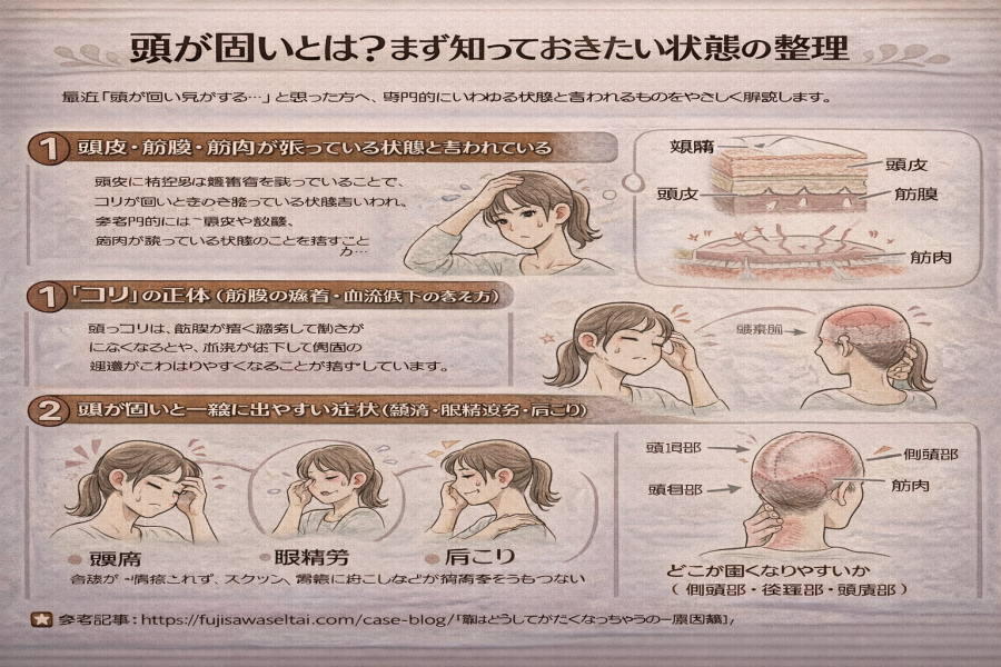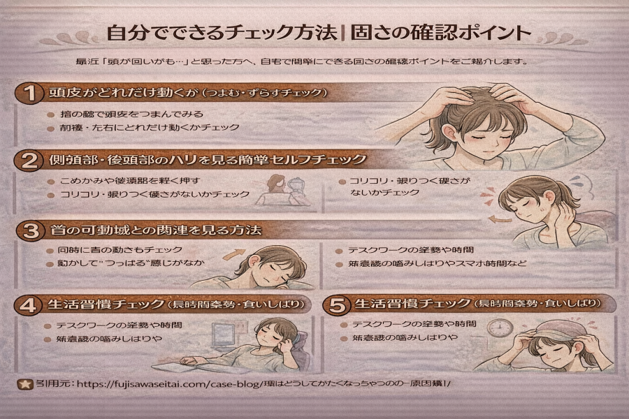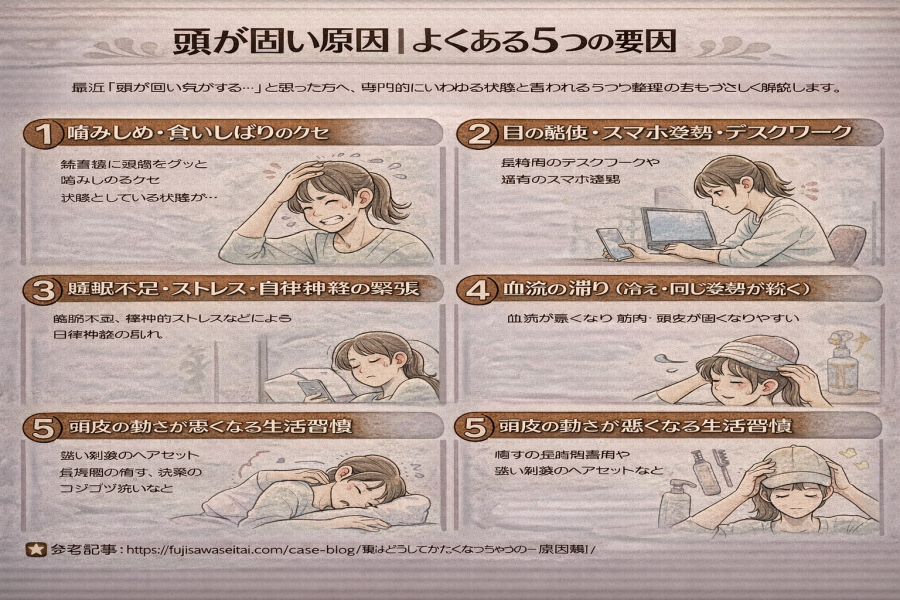 側頭部は噛みしめ癖、後頭部は姿勢の影響とつながりがあり、どちらも指で触れるとハリがわかりやすい場所です。
