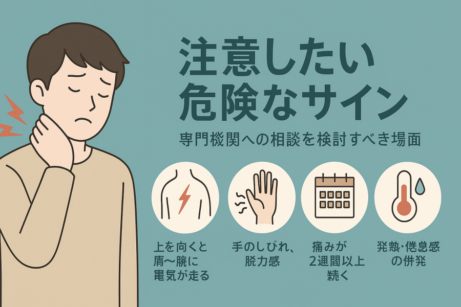 「首が痛くて上を向けない」という悩みの中には、日常の疲れや姿勢の癖から来るケースも多いと言われています。ただ、その一方で “これは少し慎重に様子を見た方がよいかもしれない” と考えられるサインも存在します。