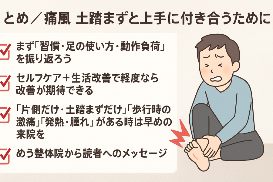 めう整体院では、痛風発作が落ち着いた後の足裏やふくらはぎの筋緊張の緩和、姿勢・歩行のバランス調整などを行い、再び負担が偏らない体づくりを目指します。