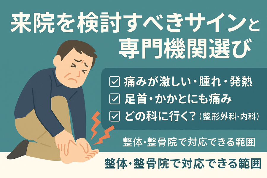 こんな時は早めに来院を(痛みが激しい・腫れ・発熱・足首・かかとにも痛み)