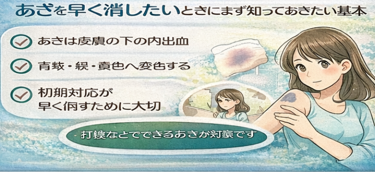 あざ 早く消す方法を知りたいとき、まず押さえておきたいのは、あざの多くが皮膚の下で起きた内出血だということです。ぶつけた衝撃で細い血管が傷つくと、血液が皮膚の下に広がって色として見えるようになると言われています。見た目は青紫で目立ちますが、表面に傷がないことも多いため、「軽そう」に見えやすいんですね。ただ、見た目が軽くても、最初の対応しだいで腫れや広がり方が変わることがあります。だからこそ、あざを早く目立たなくしたいなら、最初の過ごし方が大切です。