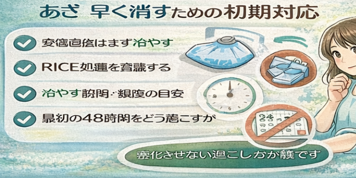 最初の24〜48時間ほどは、炎症が強く出やすい時期として説明されることが多いです。この時期は、無理に動かすより、できるだけ休ませることが大切です。あざ 早く消すには、最初の数日で悪化させないことが後の回復を左右しやすいと言われています。